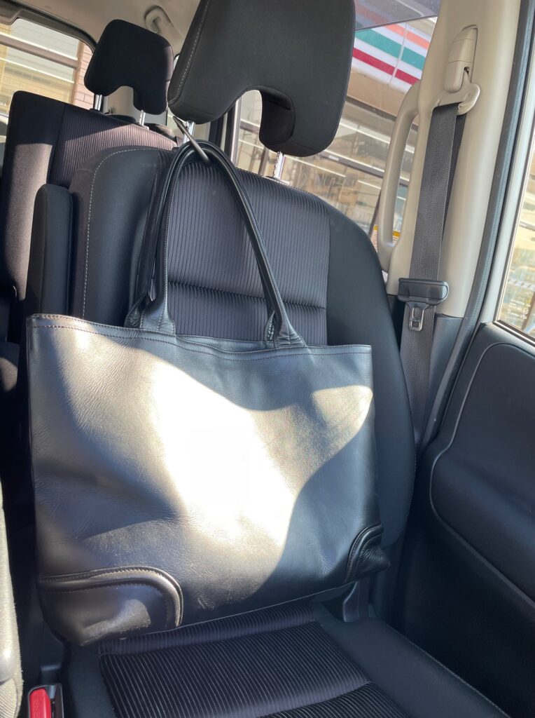 Clipaを装着したまま、助手席のヘッドレストのポール部分に掛けて固定すると、バッグが安定し、倒れにくくなります。