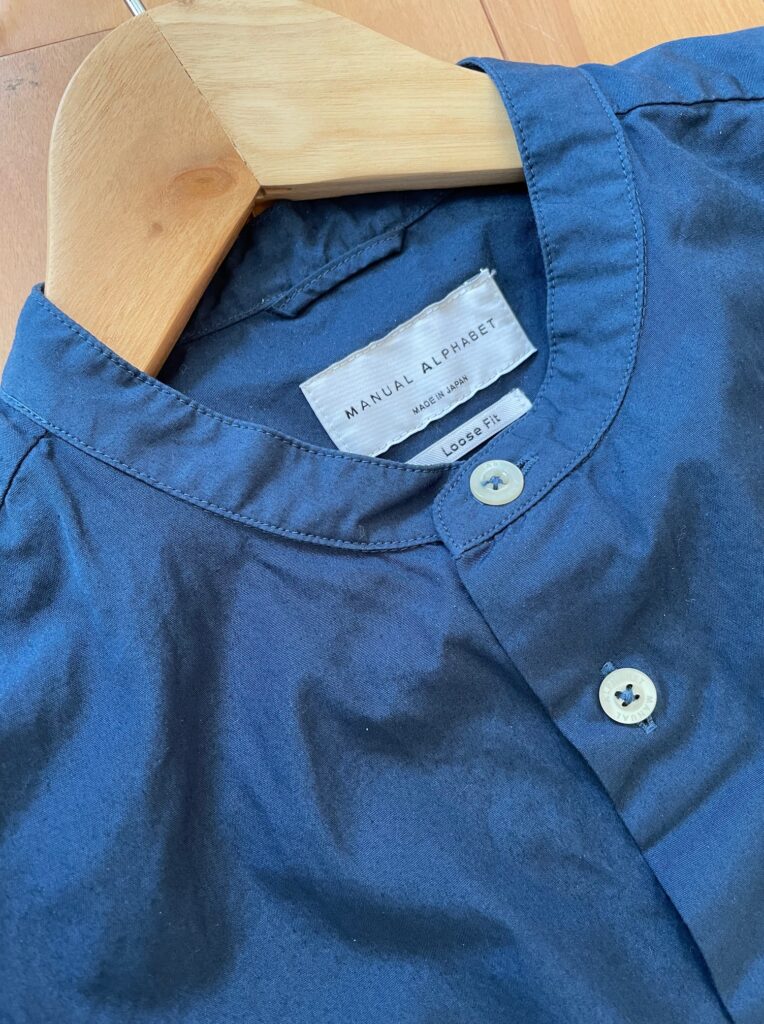 タイプライター生地のほどよいハリがあることで、バンドカラーシャツでも落ち着いた雰囲気になります。