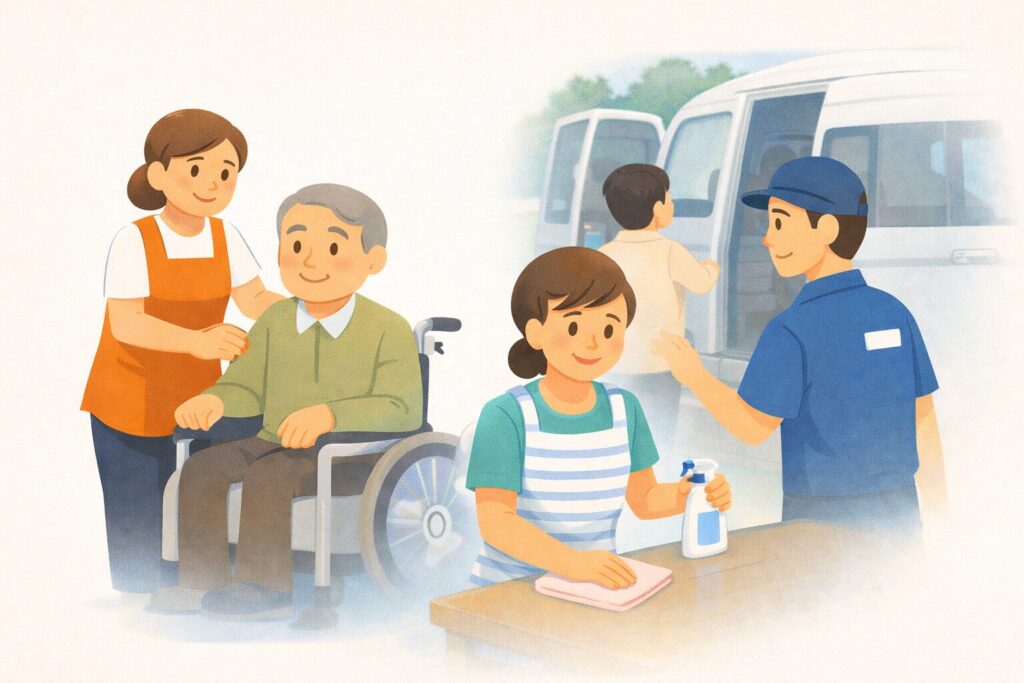 日中の直接支援、見守り、送迎、補助業務――
